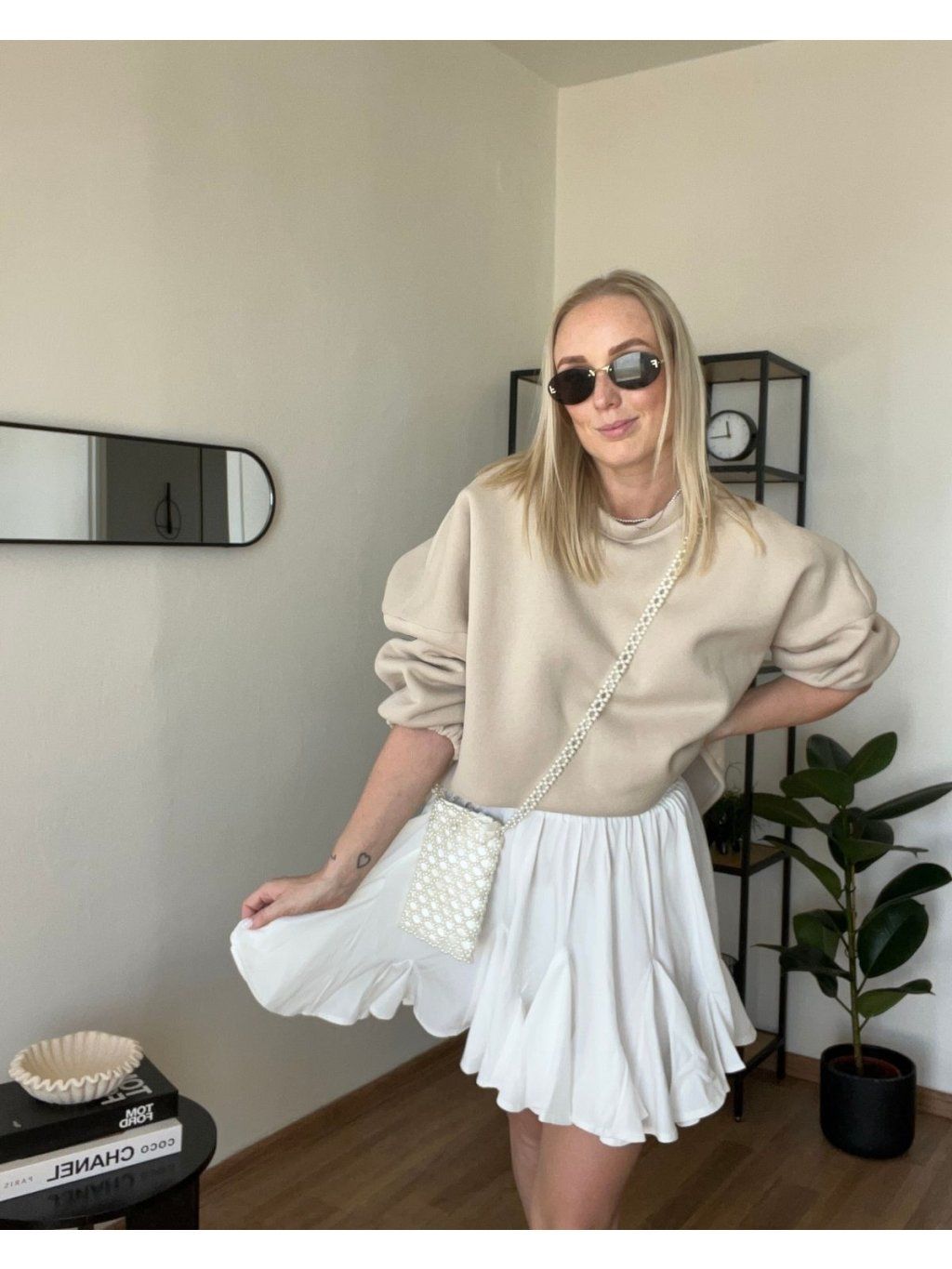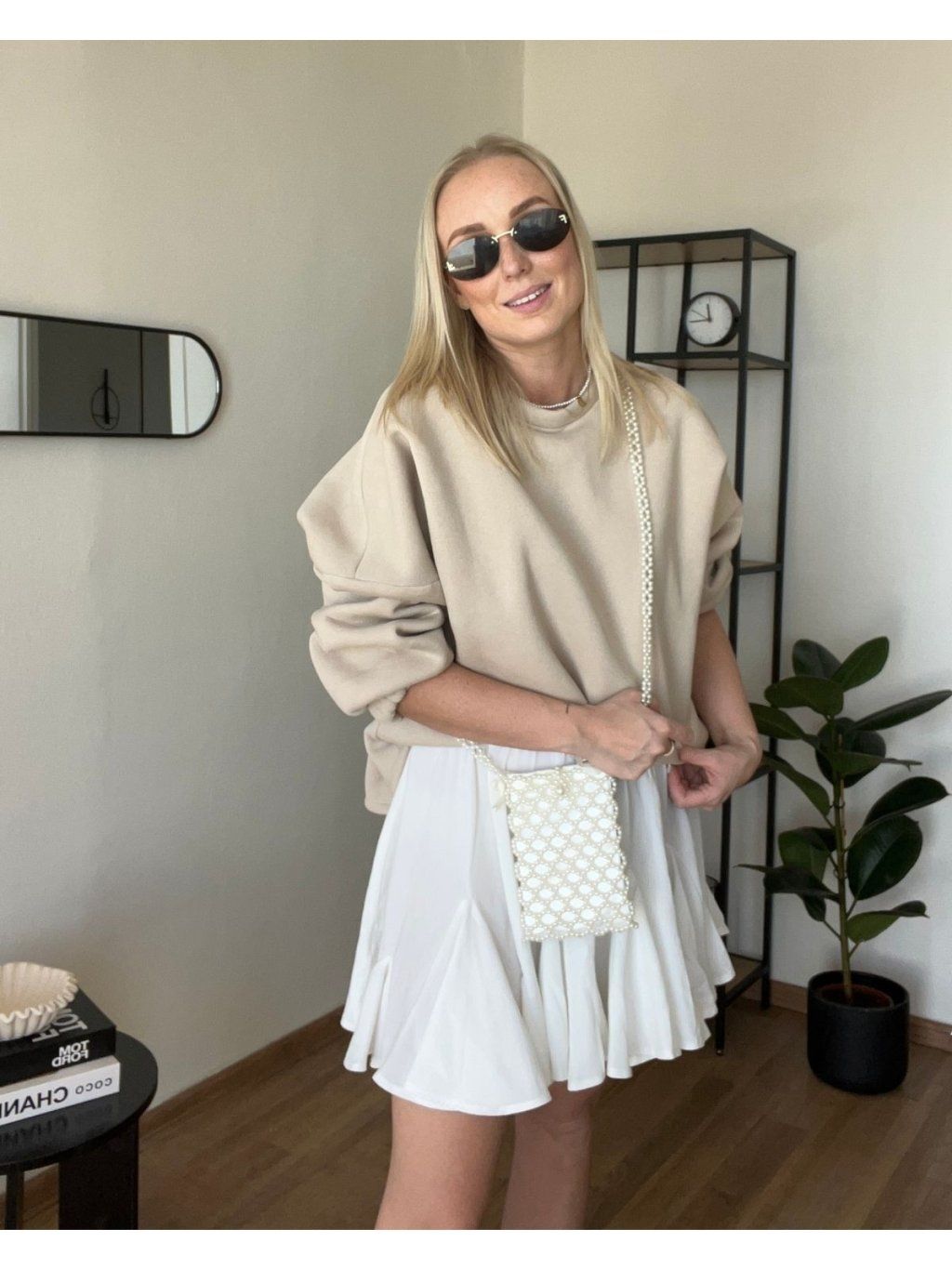 - Stylově: široké kalhoty + kabelka + brýle