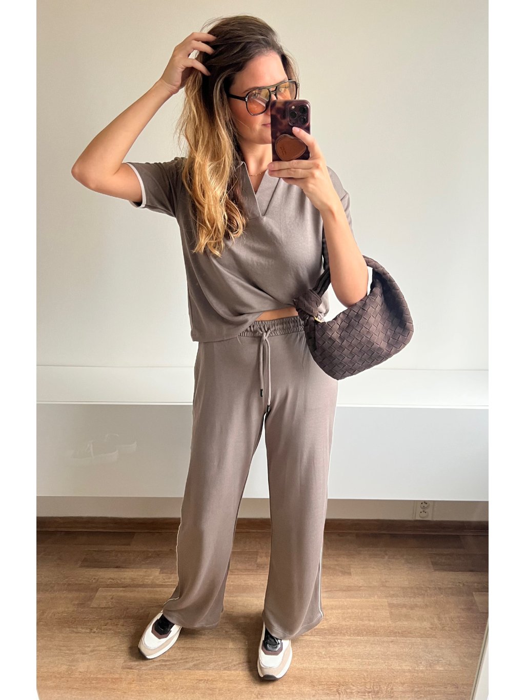 Exkluzivní tepláková souprava v hnědé barvě je ideální pro všechny, kteří chtějí spojit pohodlí s moderním stylem. Horní díl má volnější střih s krátkým rukávem, spodní díl tvoří pohodlné kalhoty s elastickým pasem a stahovací šňůrkou. Po stranách kalhot najdeš decentní proužek, který opticky prodlužuje postavu a dodává soupravě šmrnc.