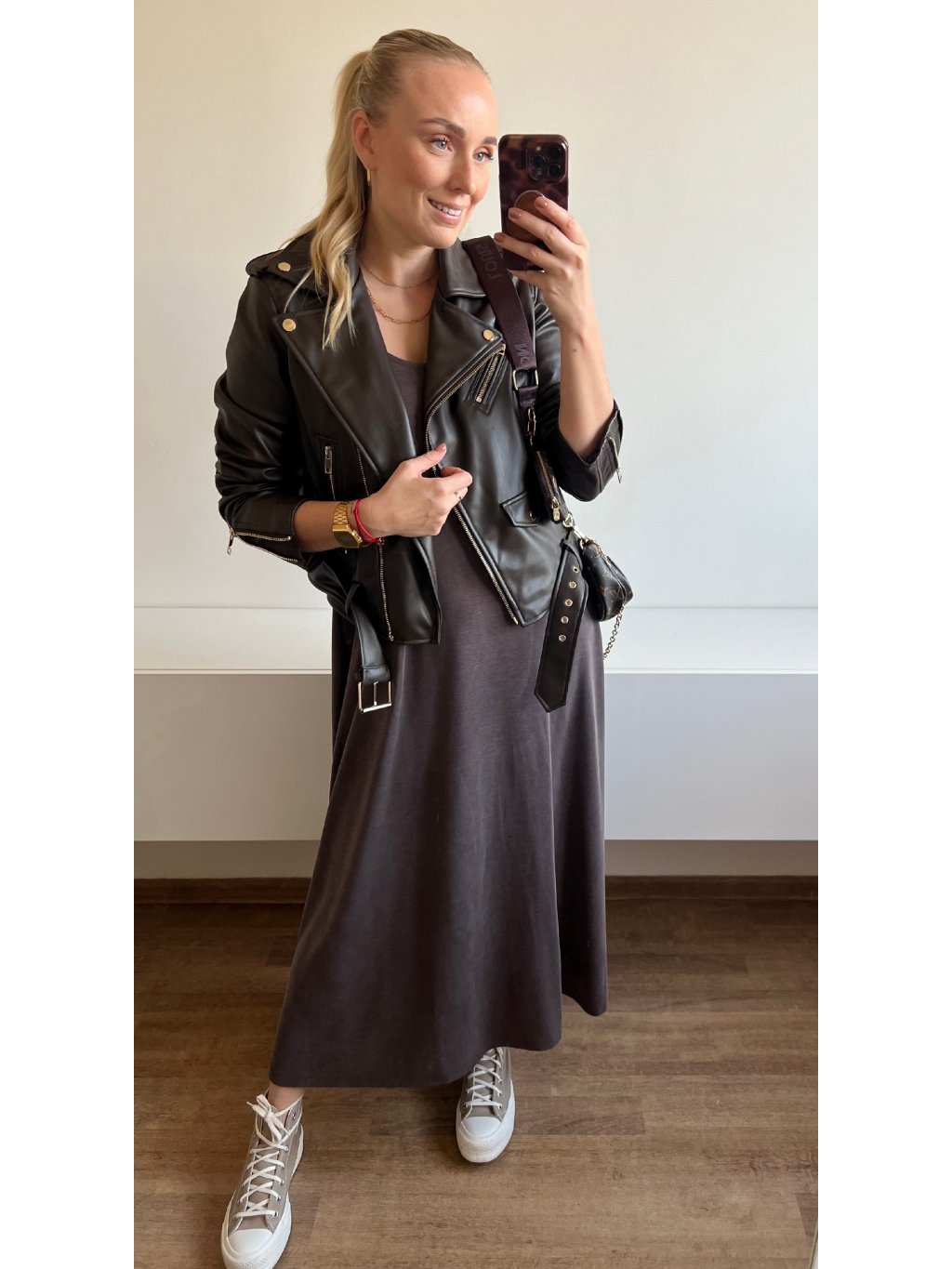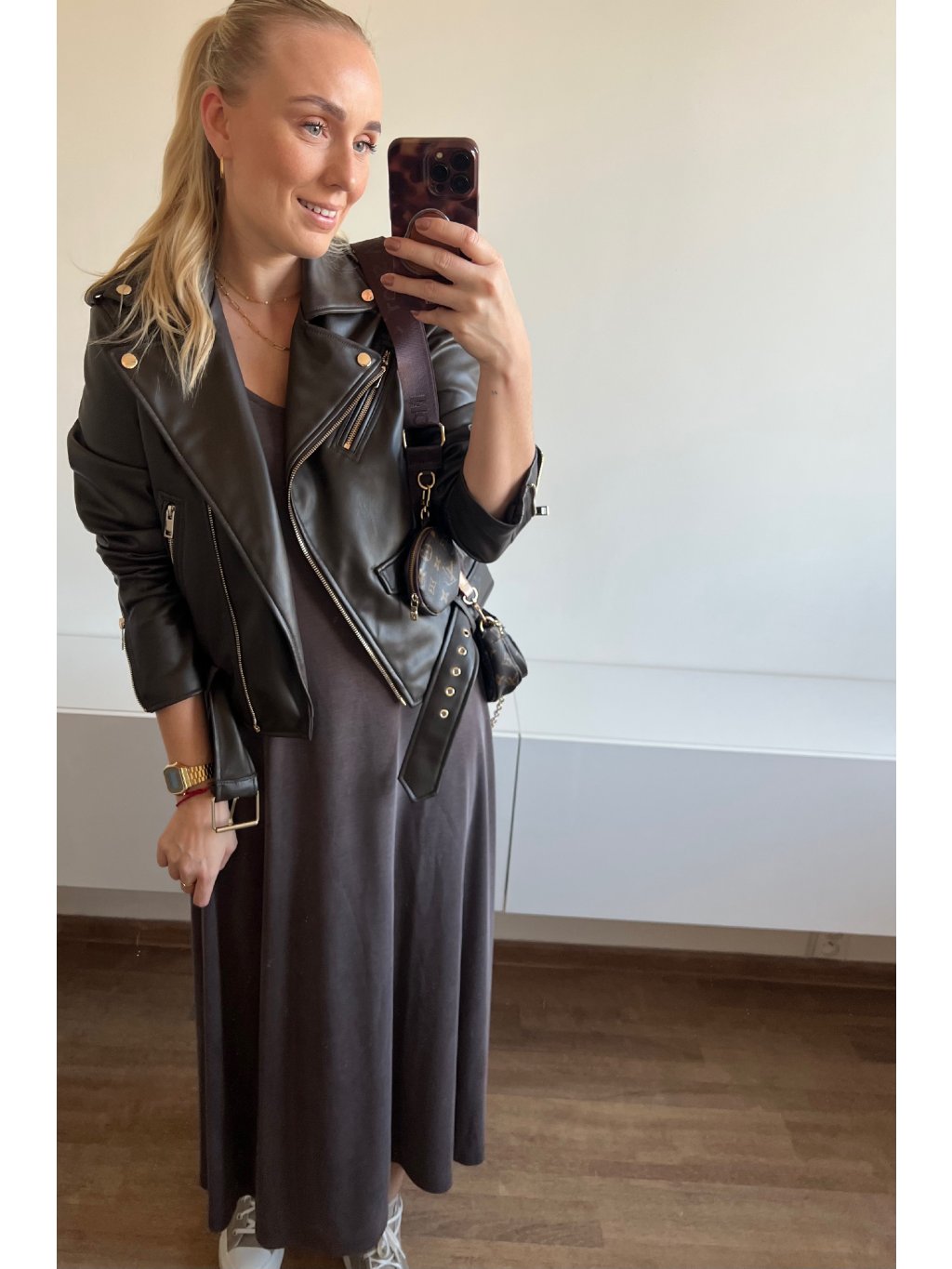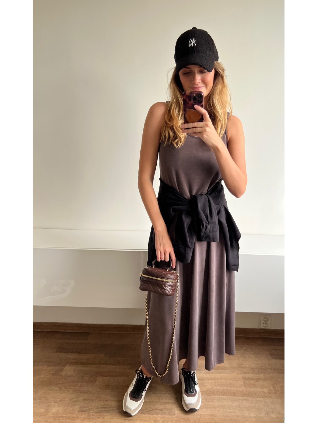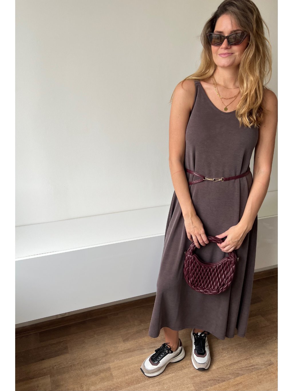 Hnědé maxi šaty na široká ramínka – pohodlný a univerzální kousek, ve kterém se budeš cítit skvěle každý den. Dostupné také v šedé barvě.