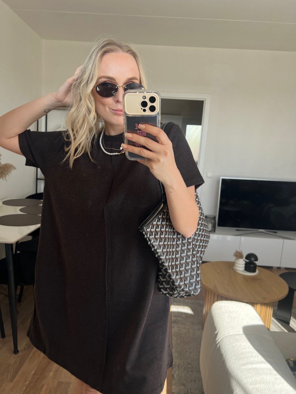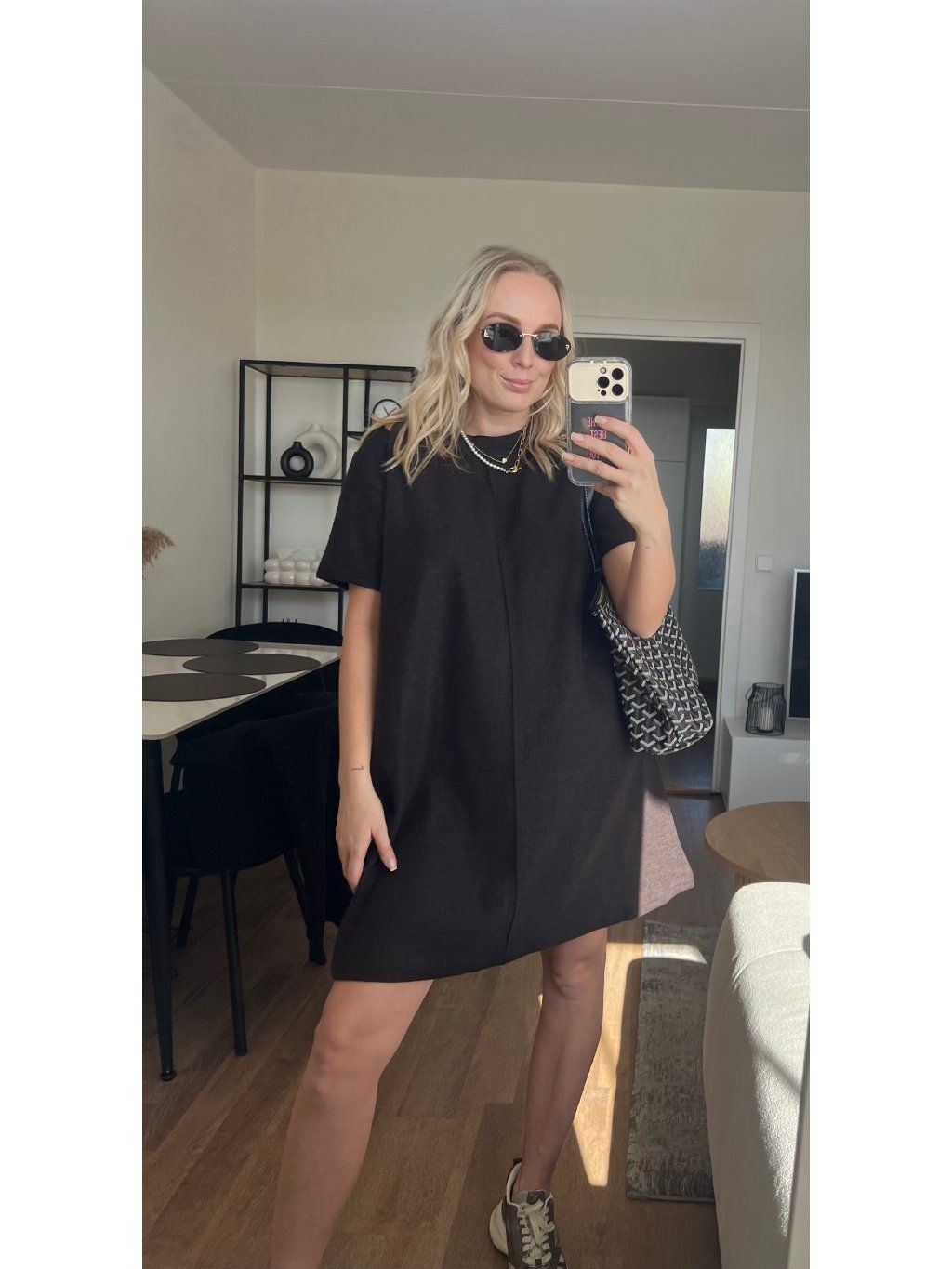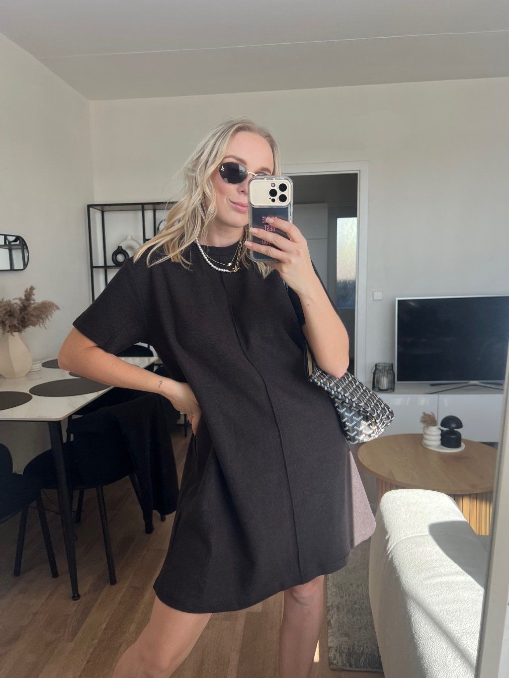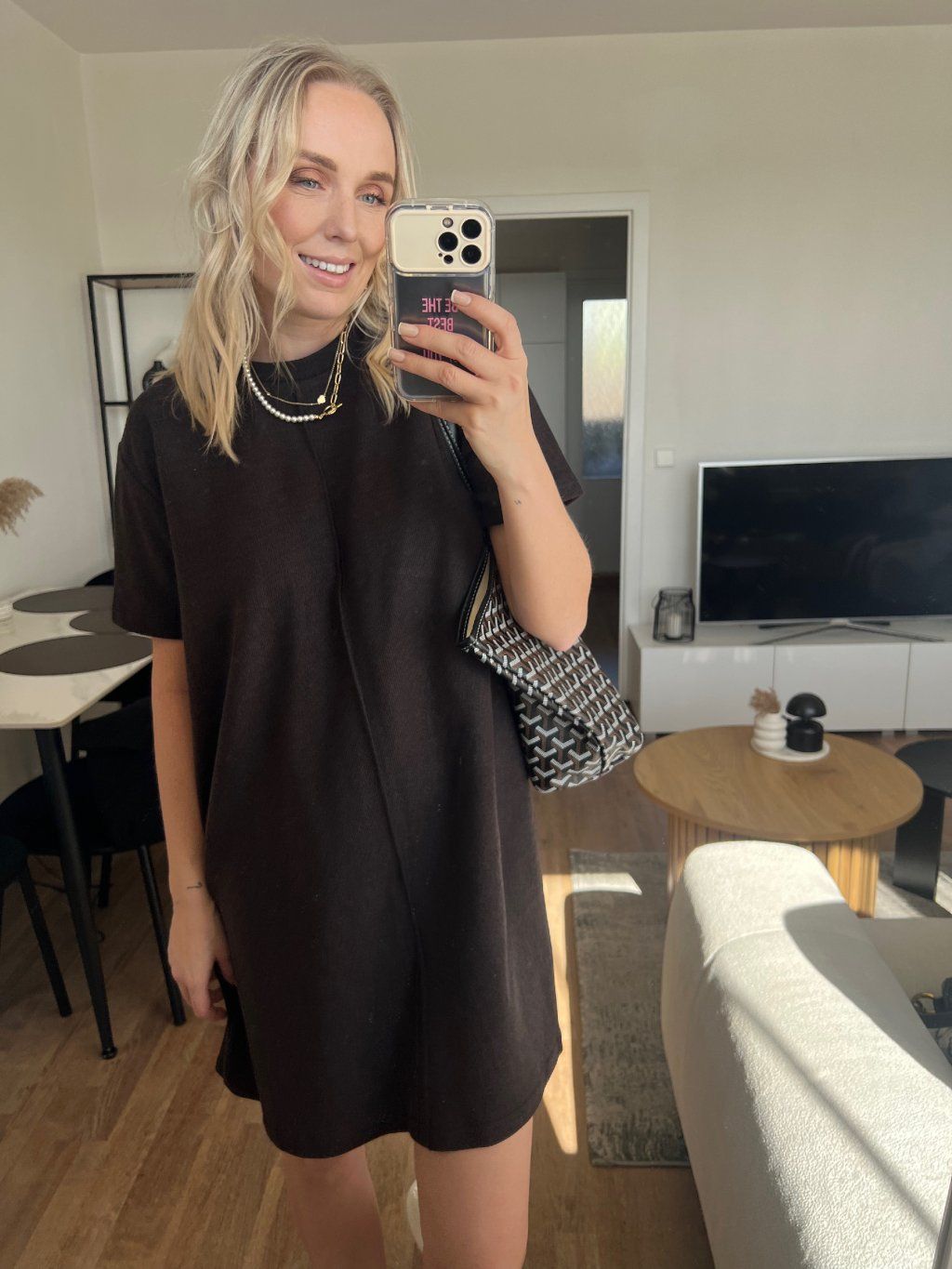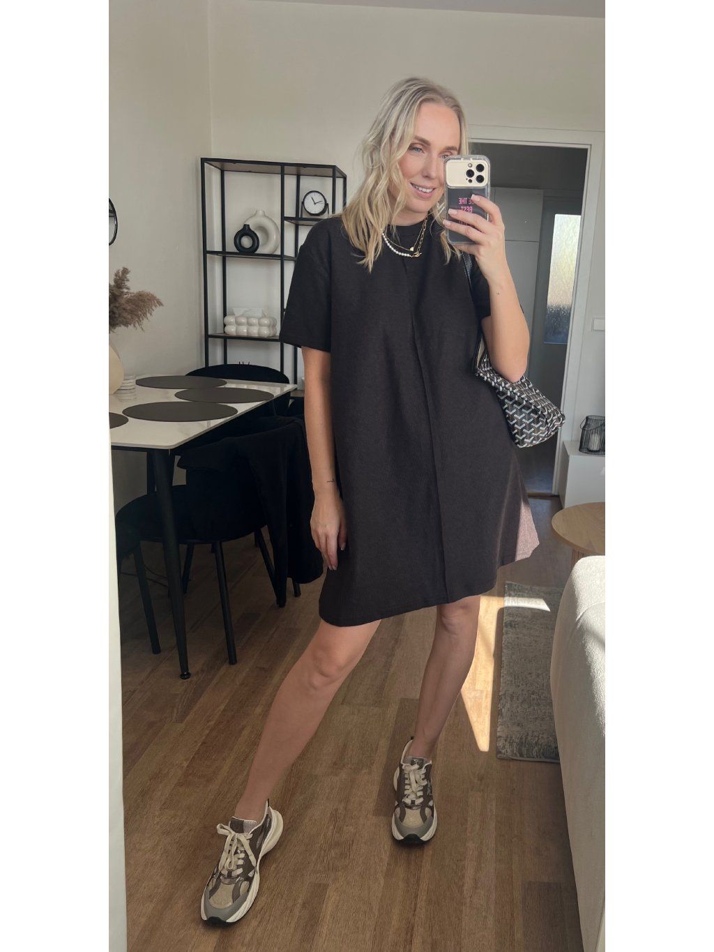 Tričkové šaty ve volnějším střihu, které udělají outfit během minuty. Pohodlné, nadčasové a skvělé s teniskami i s kozačkami.