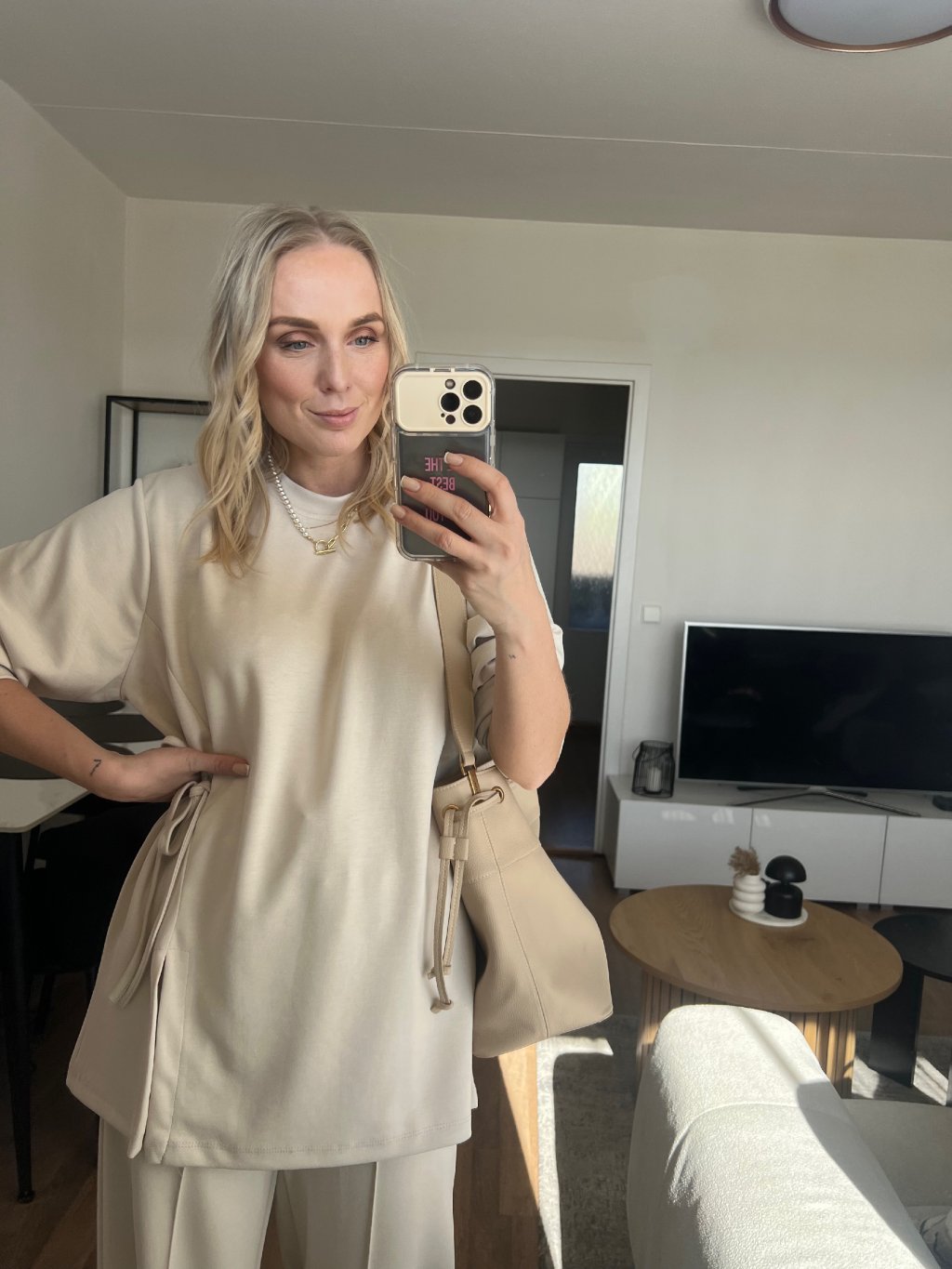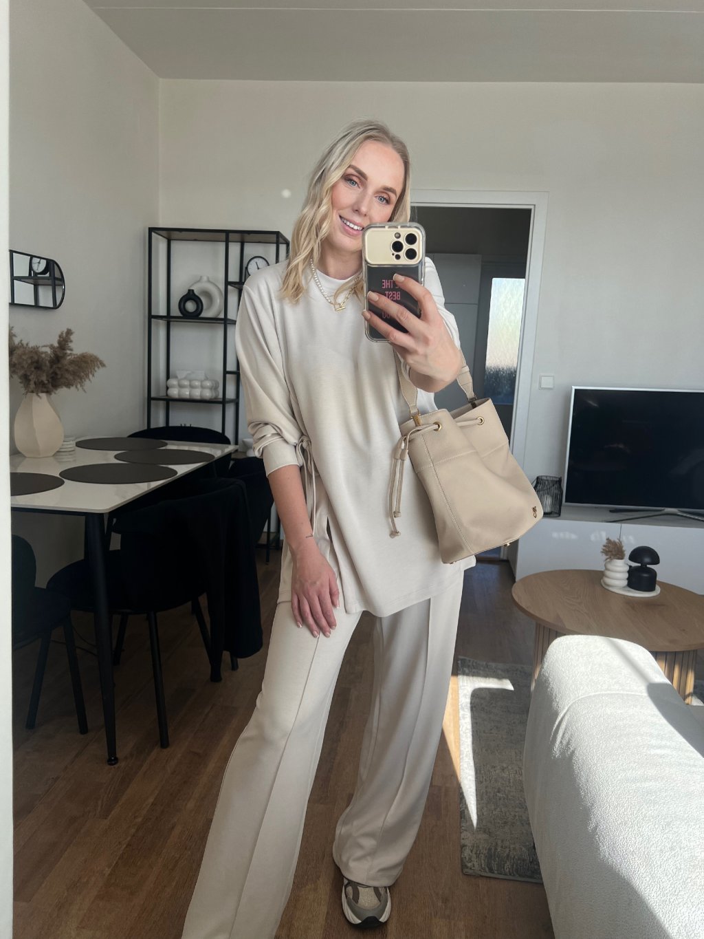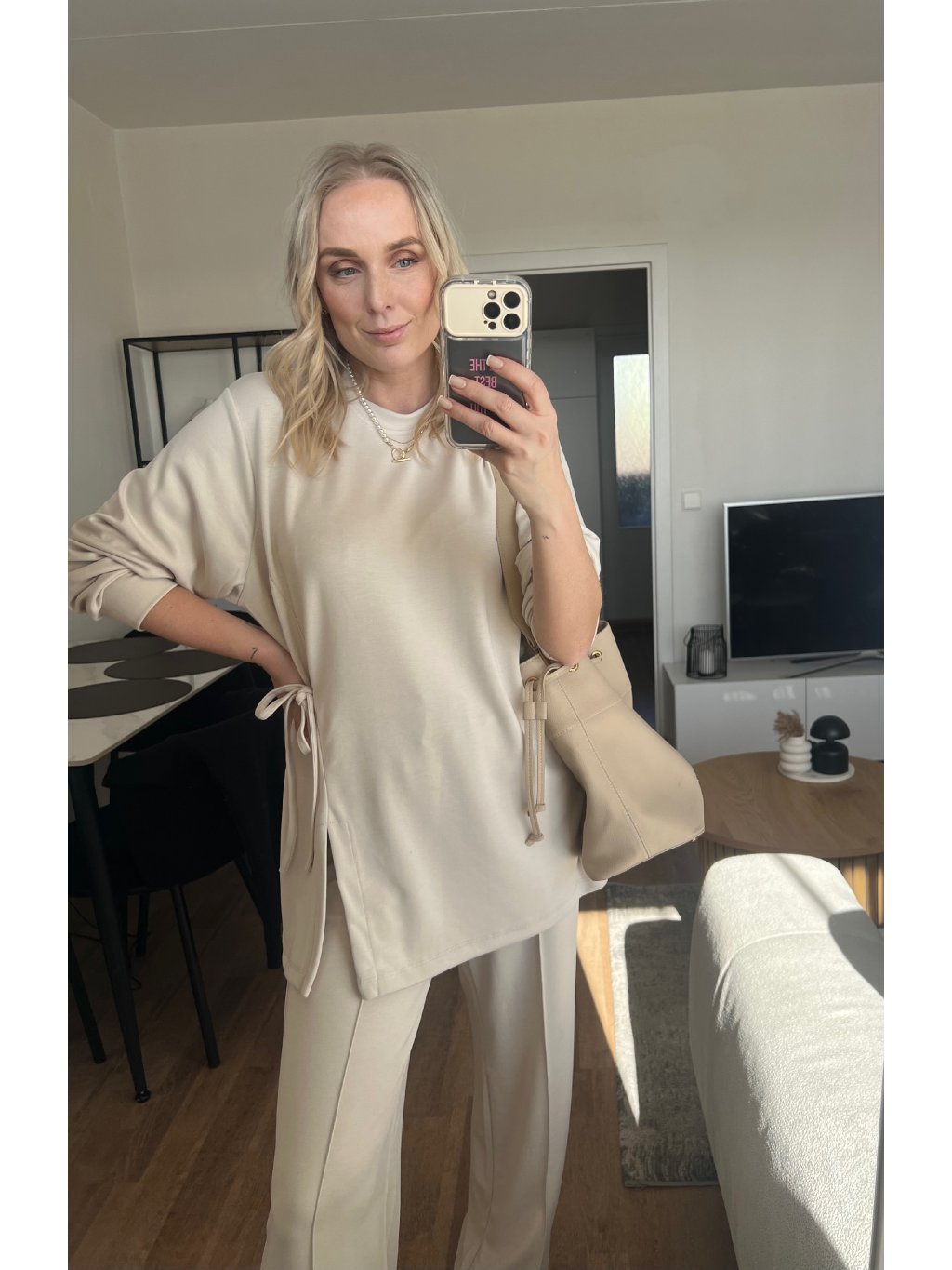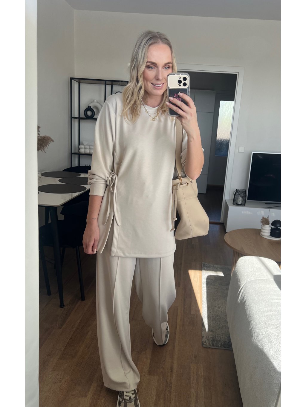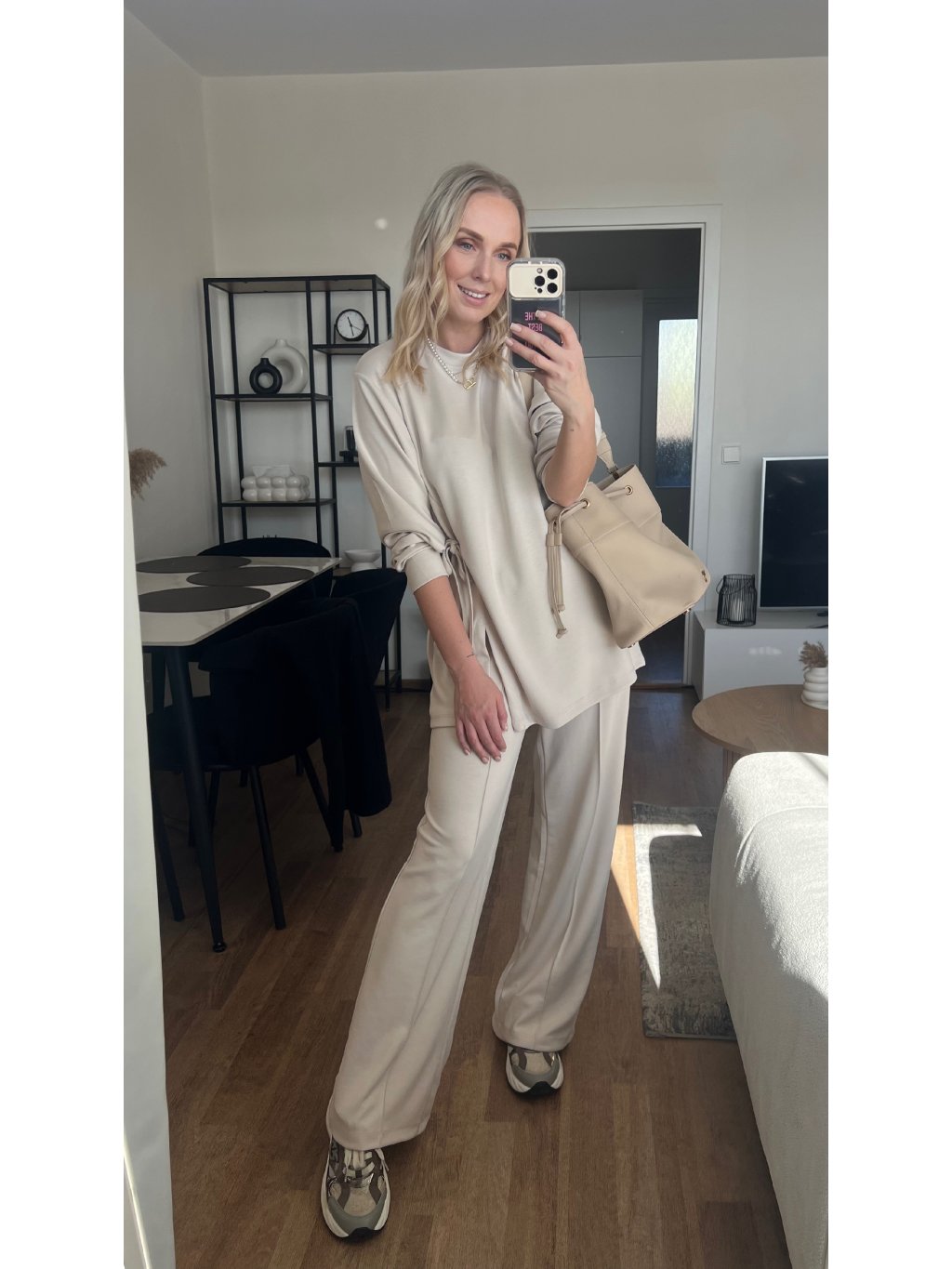 Souprava, která vypadá promyšleně, ale nosí se jako domácí pohodlí. Tunika s dlouhým rukávem má moderní asymetrický střih a detail stahování na boku, díky kterému vytvoříš hezkou siluetu a jemně zvýrazníš pas. Široké kalhoty dodají outfitu luxusní „minimal“ vibe a zároveň jsou extrémně pohodlné.
