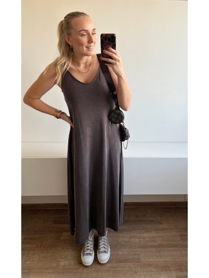 Exkluzivní šaty v neutrální šedé barvě spojují jednoduchost, pohodlí a moderní styl. Lehký splývavý materiál se krásně přizpůsobí postavě a poskytuje maximální komfort po celý den. Hlavním prvkem šatů je uzel v pase, který opticky zvýrazňuje siluetu, zakrývá případné nedostatky a dodává šatům jedinečný šmrnc.